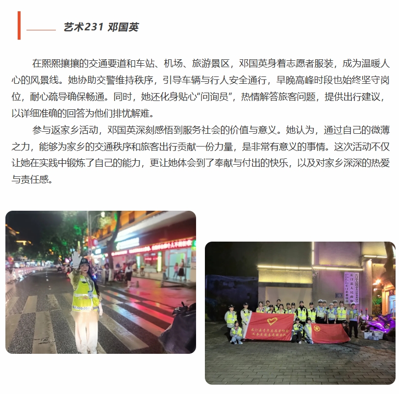 此次寒假返家乡社会实践活动,文创学院的同学们用自己的青春和热情,在不同的岗位上发光发热,为家乡的建设和发展添砖加瓦。他们在实践中受教育、长才干、作贡献,不仅提升了自身的综合素质,也展现了新时代青年的良好风貌。相信在未来的日子里,他们将继续秉持这份责任与担当,为实现中华民族伟大复兴的中国梦贡献更多的青春力量!