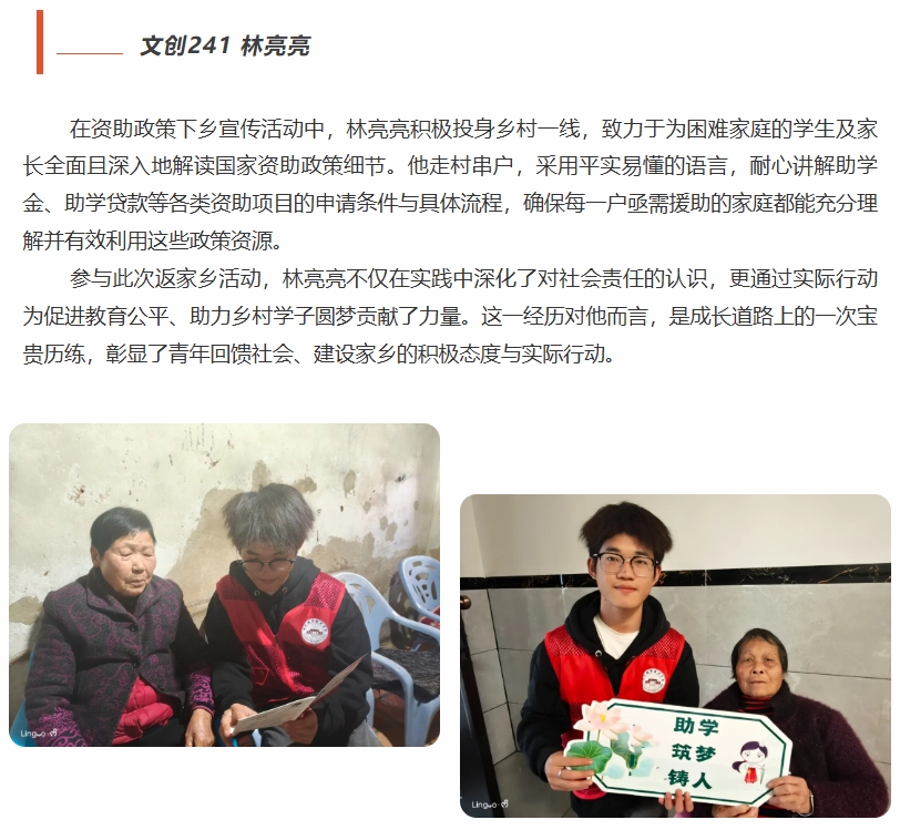 寒假期间,文创学院的同学们积极响应号召,投身返家乡社会实践活动,用实际行动展现新时代青年的责任与担当,为家乡发展贡献青春力量。